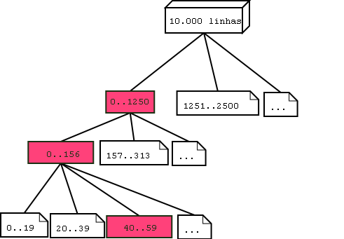 7) O algoritimo btree aprofundou-se até determinar os limites exatos em que se baseará a pesquisa, no exemplo acima, o elemento número 51, estará no "nó" que atende a região "40 ao 59" que passa a ser uma folha de nossa maravilhosa arvore. Este foi o fim da pesquisa binária, a partir deste ponto o banco de dados prossegue normalmente com a busca, porém apenas na "folha" indicada que possui apenas 19 linhas (40 ao 59). Isso é muito mais vantajoso do que realizar a busca de 1 entre 10.000 linhas como seria usando um índice comum.
